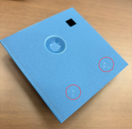 塗装工程を無くすために樹脂フィルム鋼板(ヒシメタル鋼板)を使用していましたが、インダイレクト方式のスポット溶接時に、表面の樹脂フィルムが焼けてしまい、白い跡(画像の赤い〇)がついていました。このスポット溶接痕を無くし、外観をよりきれいにすることが課題でした。